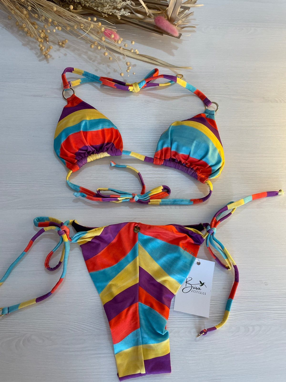 Elegante bikini, cuenta con amarres en el cuello y la espalda, relleno removible, top de modelo cortina en el busto, braguita de corte reto.