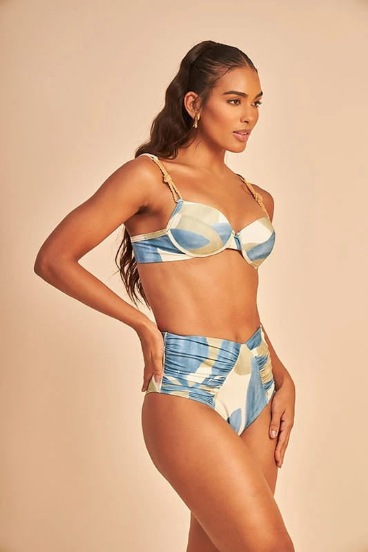 El bikini está compuesto por un sujetador de soporte con aros y copa de casco, tirantes ajustables con detalles y refuerzo en el busto,(con broche fijo).La braguita tipo panty cuenta con un fruncido estratégico que realza la silueta y brinda comodidad para disfrutar de un día en la playa.