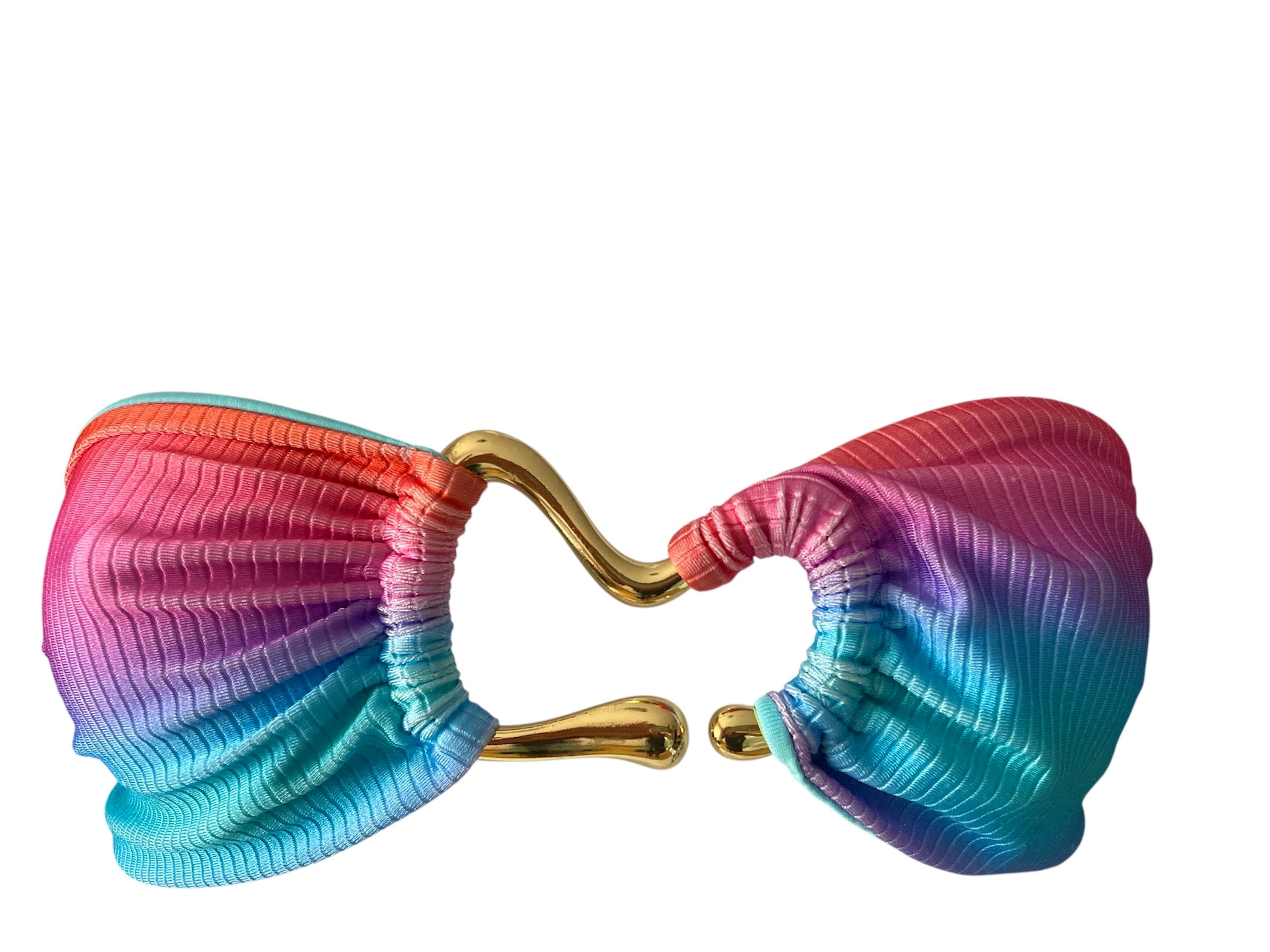 • Top tipo faja, sin relleno, decorado con un herraje dorado orgánico en el centro, que aporta un detalle elegante y luminoso.